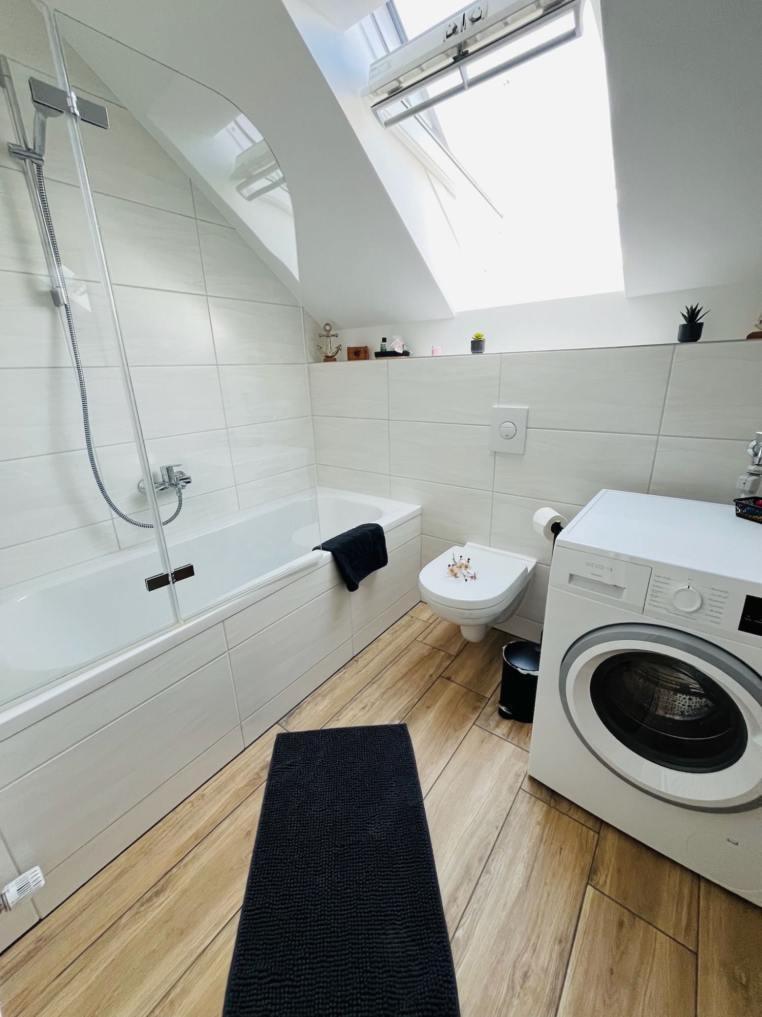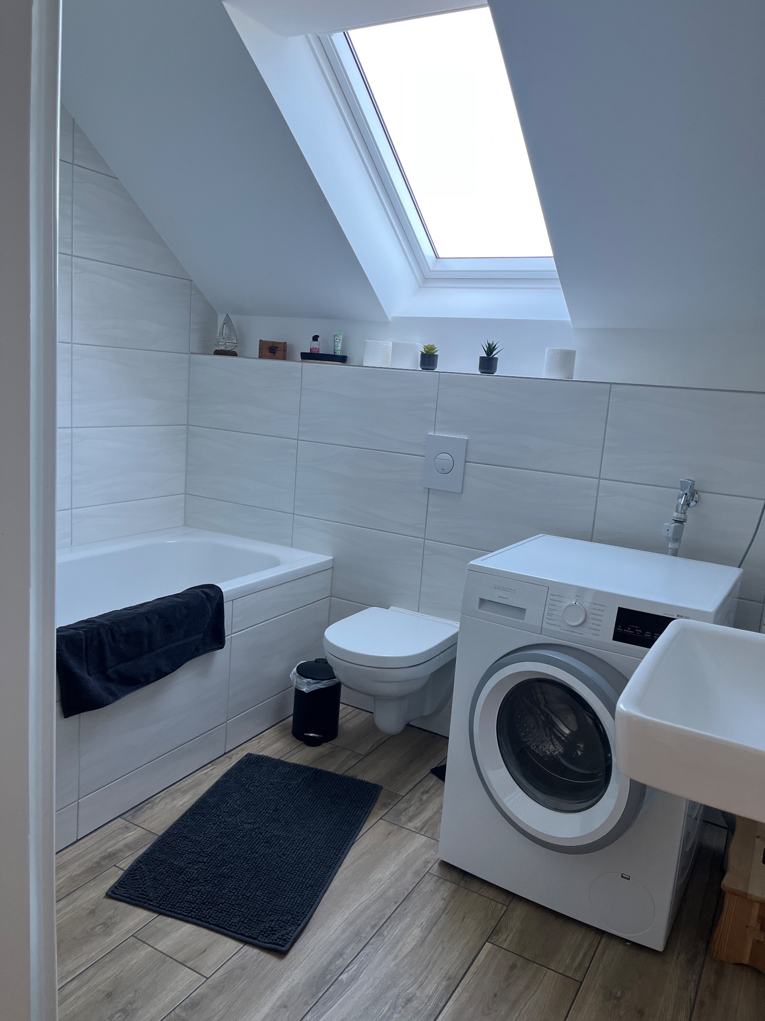 Badezimmer: Ein geräumiges Bad mit Badewanne, Waschmaschine, Fön, Handtüchern und Badevorlegern für Ihren Komfort.