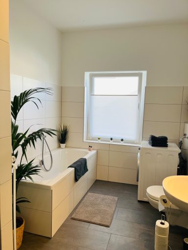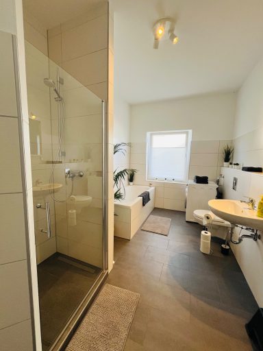 Badezimmer: Ein geräumiges Bad mit Badewanne, Dusche, Fön, Handtüchern und Badvorlegern für Ihren Komfort.