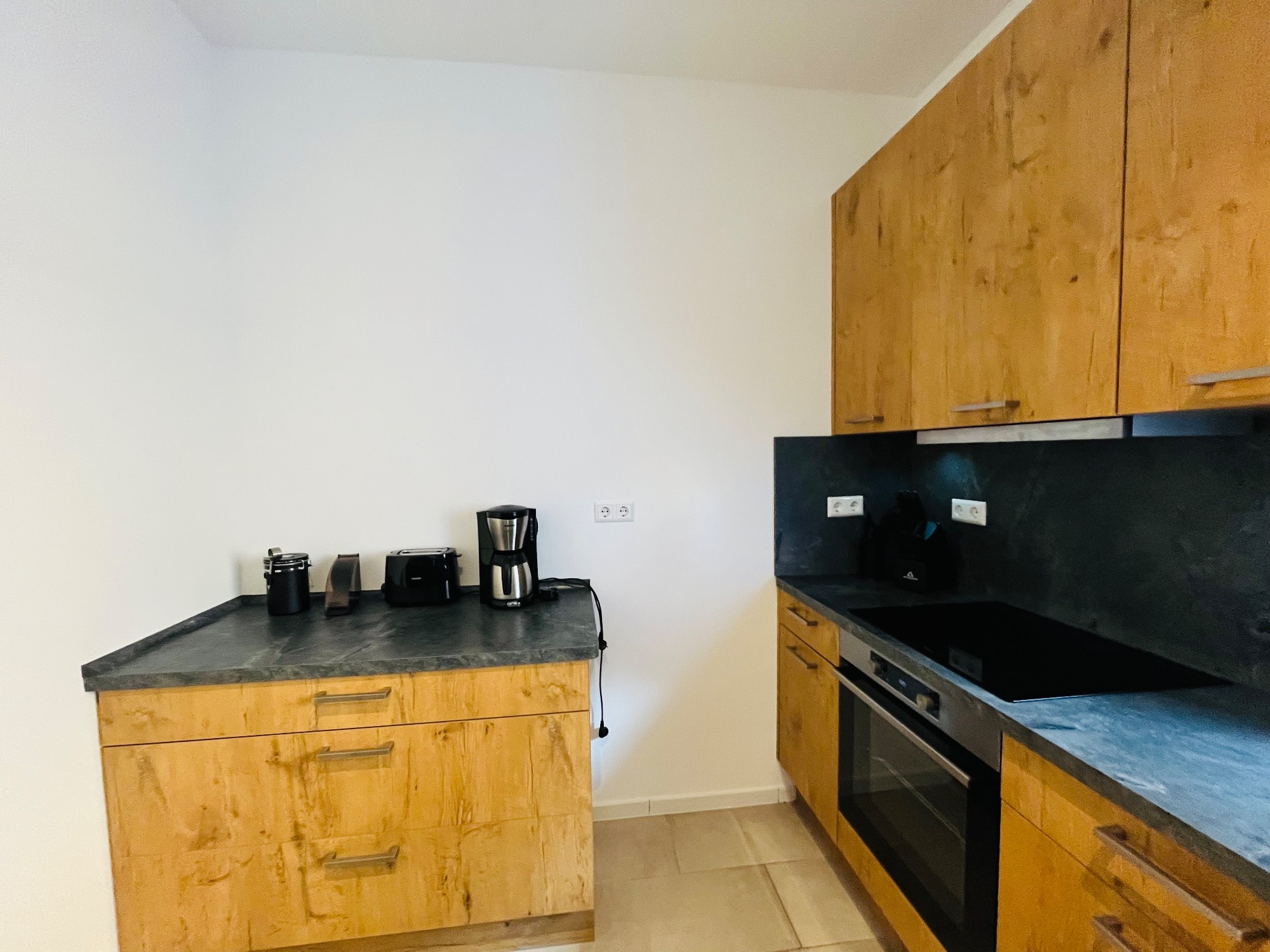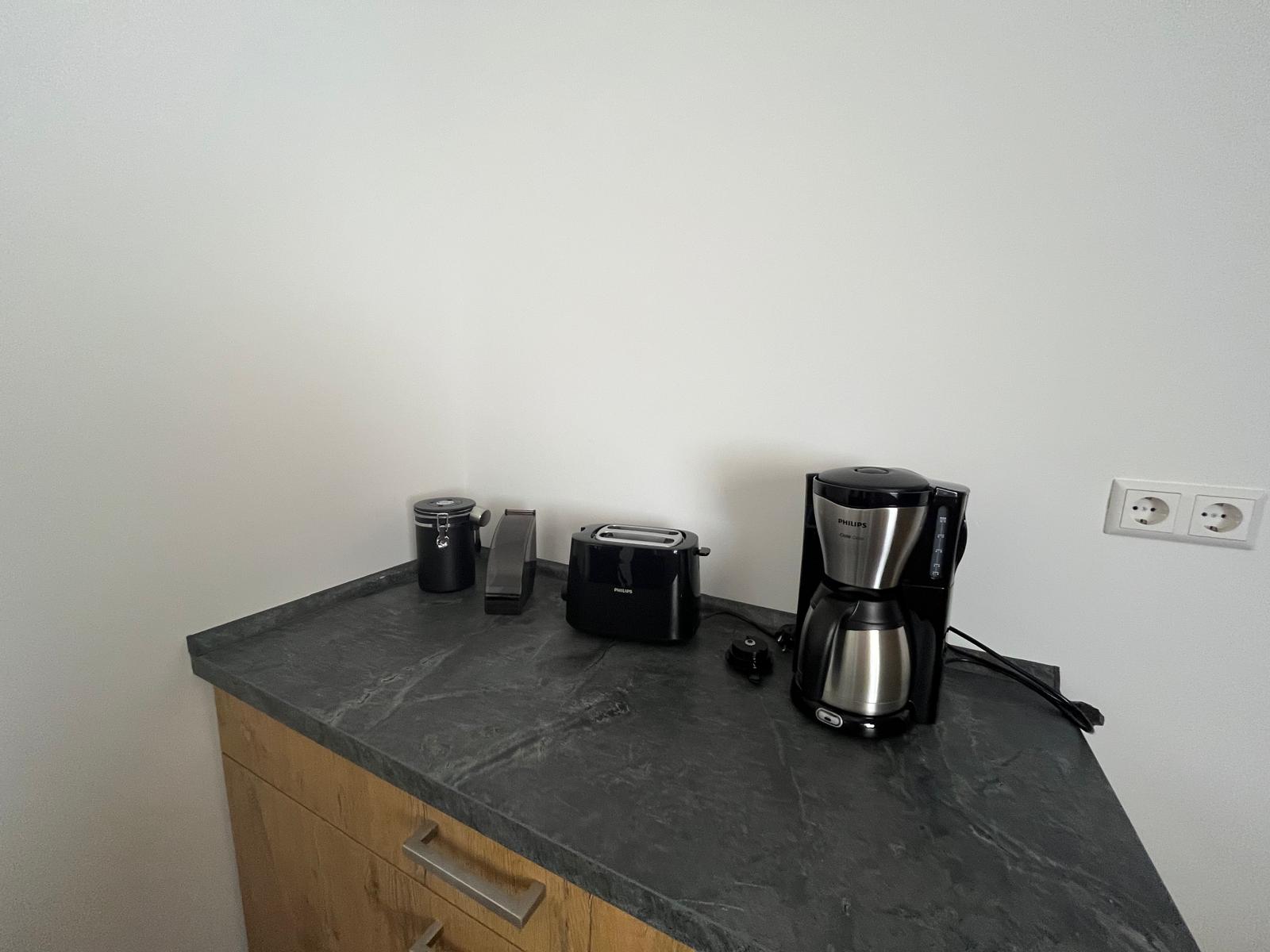 Küche: Voll ausgestattet mit Backofen, Geschirrspülmaschine, Mikrowelle, Kühlschrank, Wasserkocher, Ceran-Kochfeld, Geschirr, Gläser, Töpfe, Kaffeeautomat und Toaster.