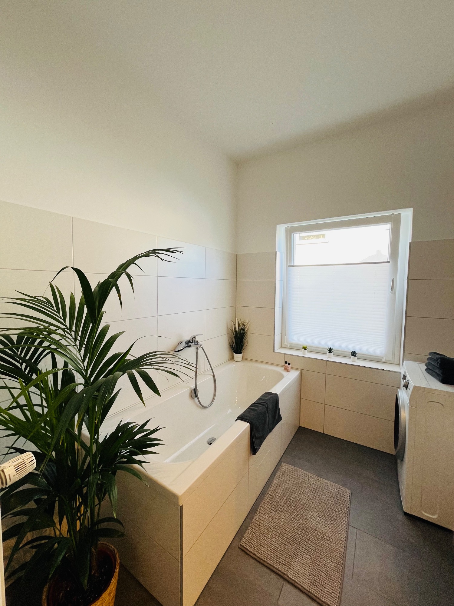 Badezimmer: Ein geräumiges Bad mit Badewanne, Dusche, Fön, Handtüchern und Badvorlegern für Ihren Komfort.